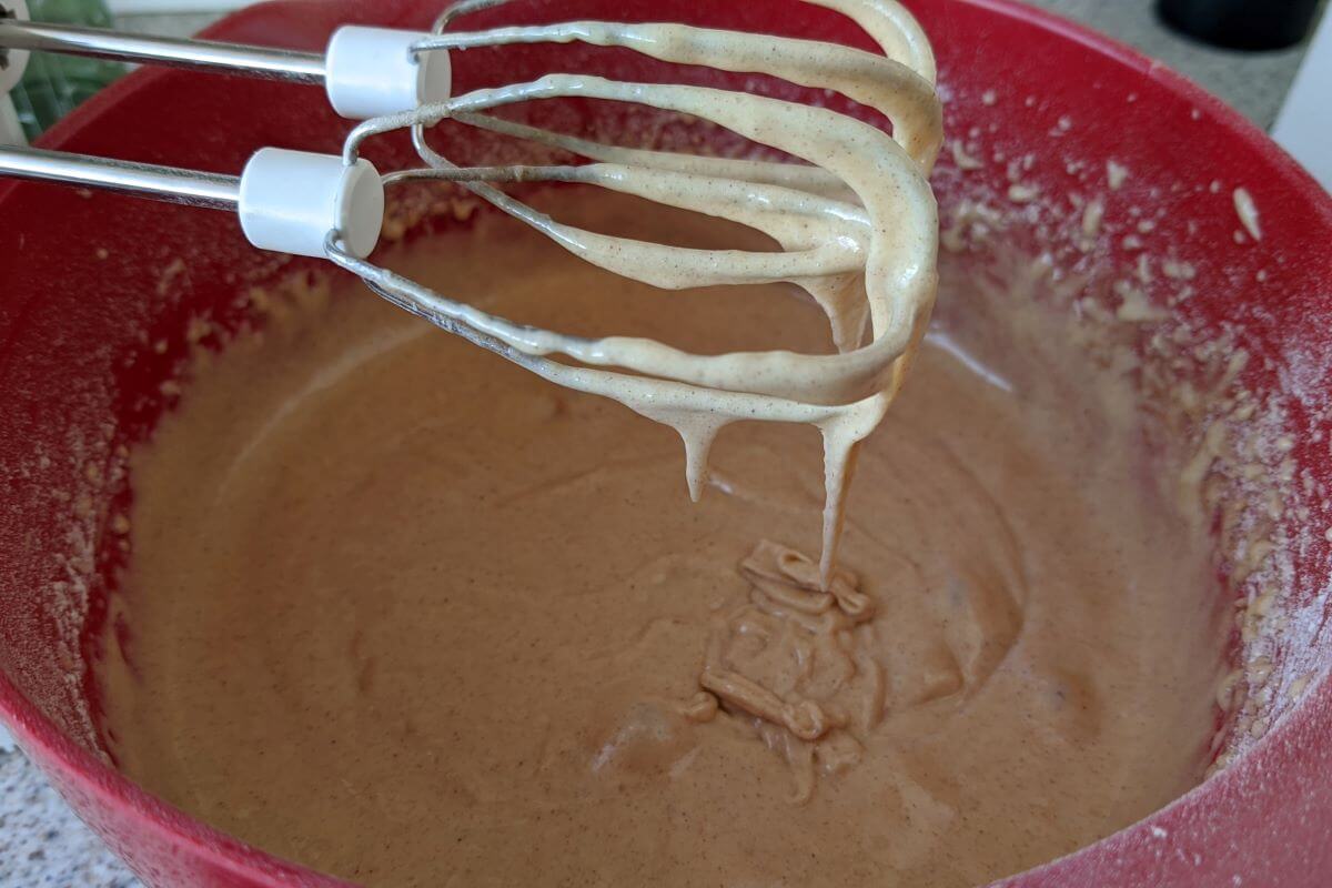 Add the flour, baking powder, cinnamon, oil and mix further.